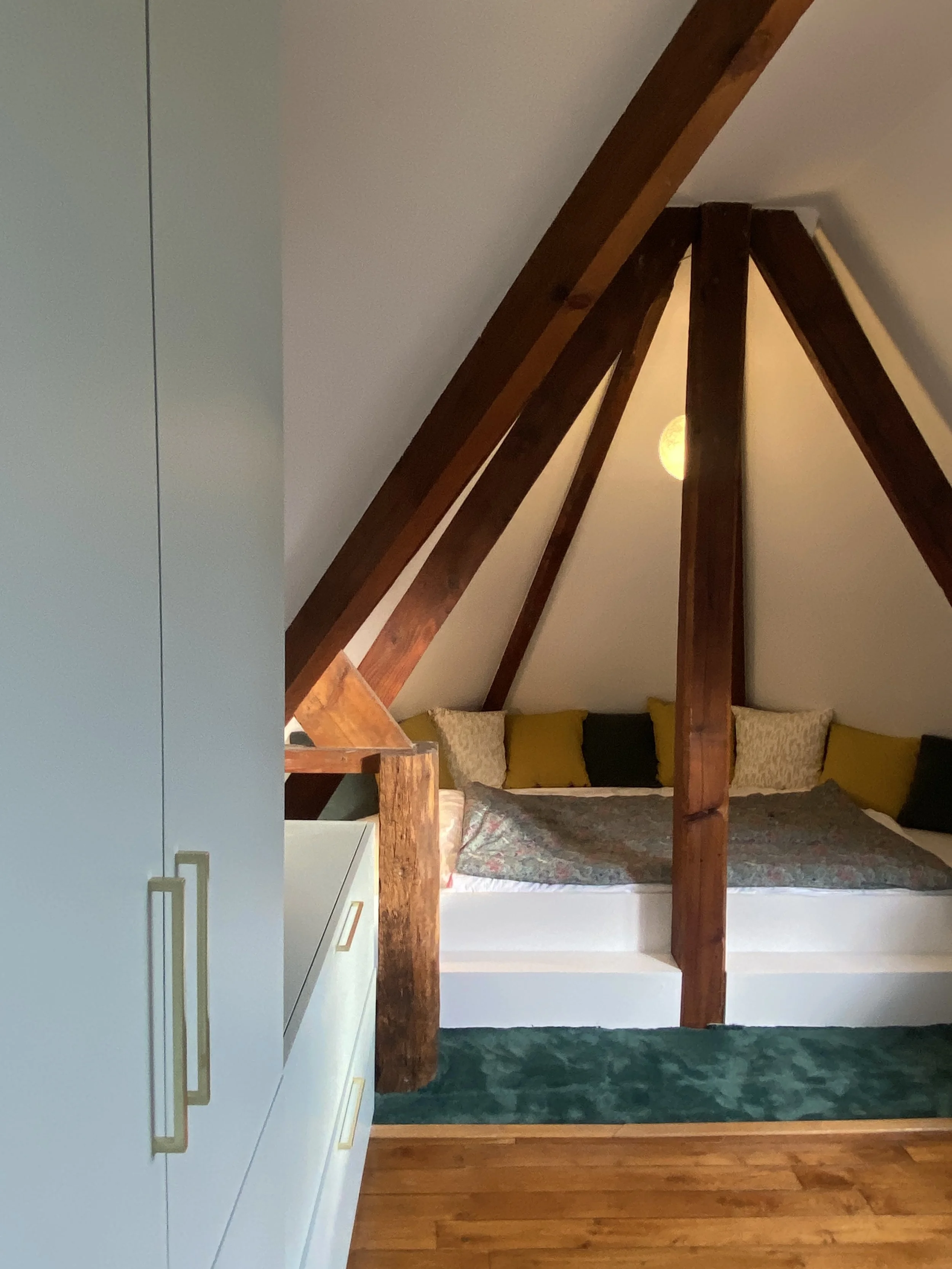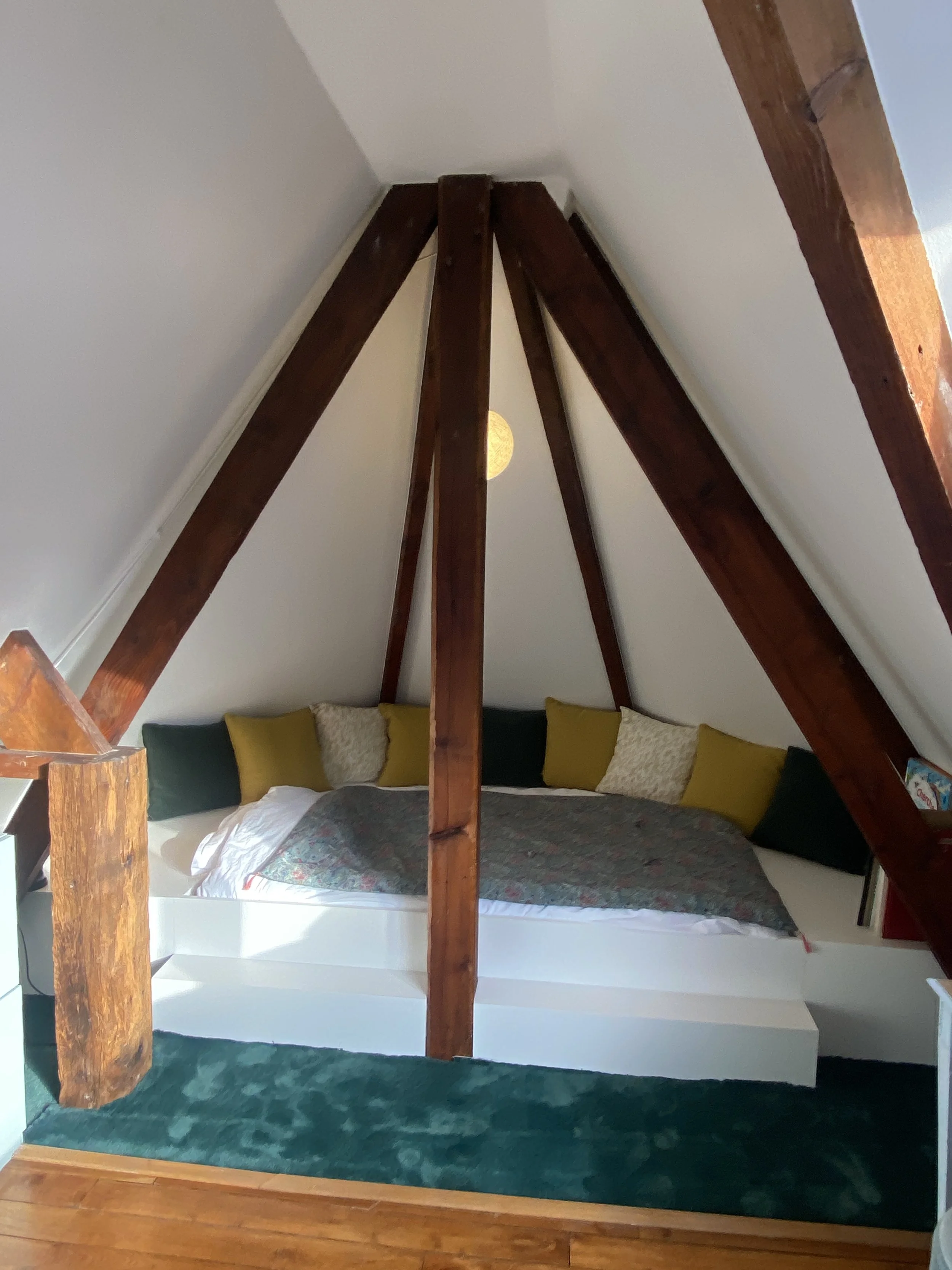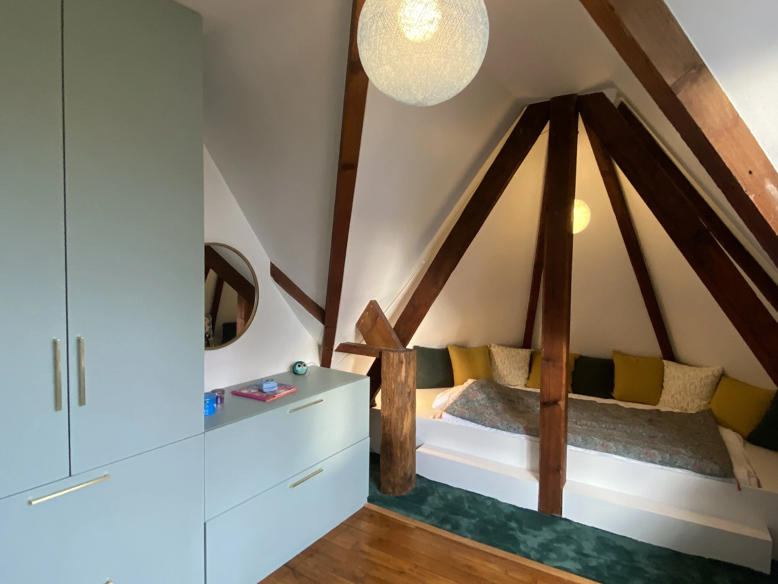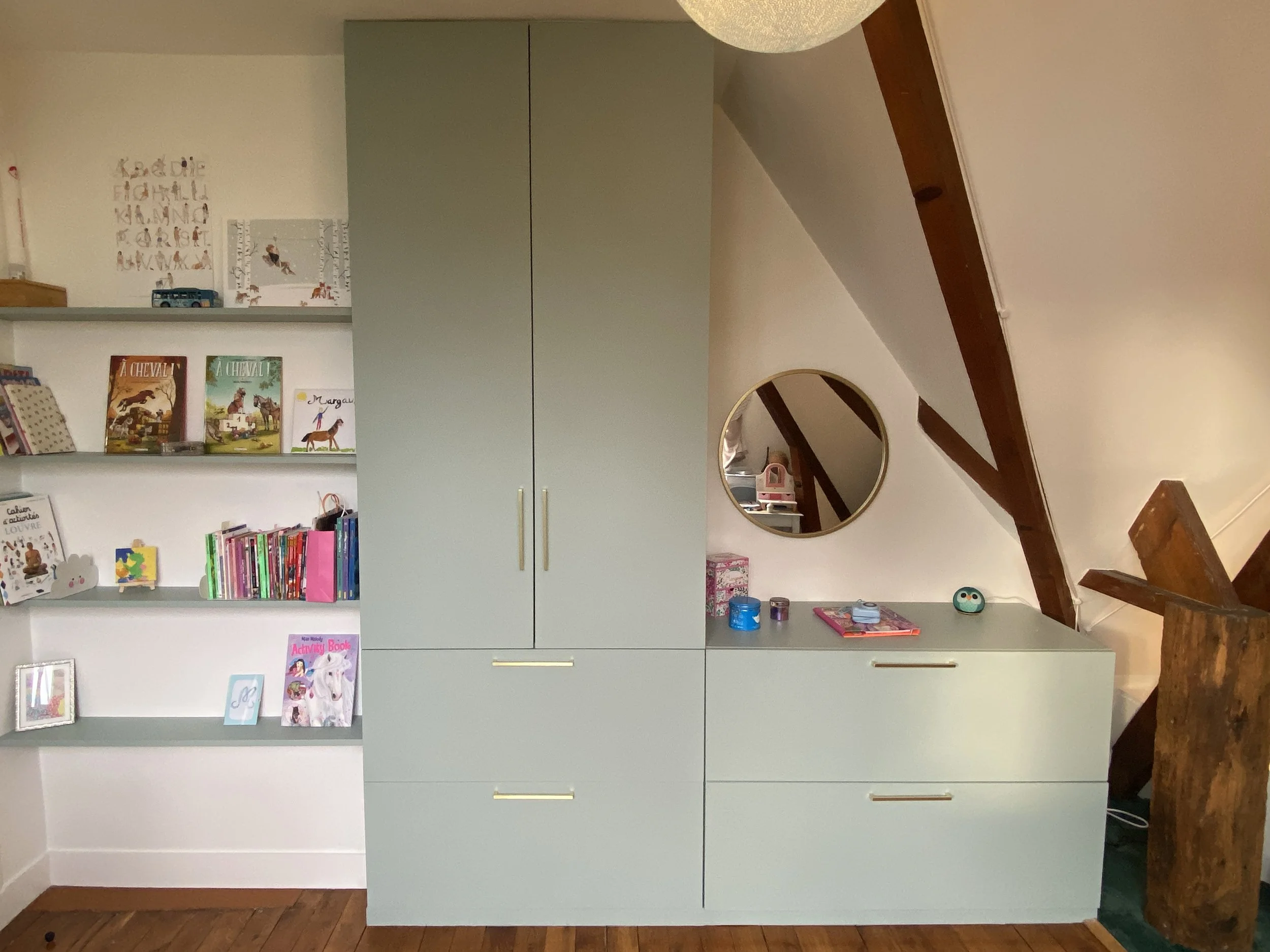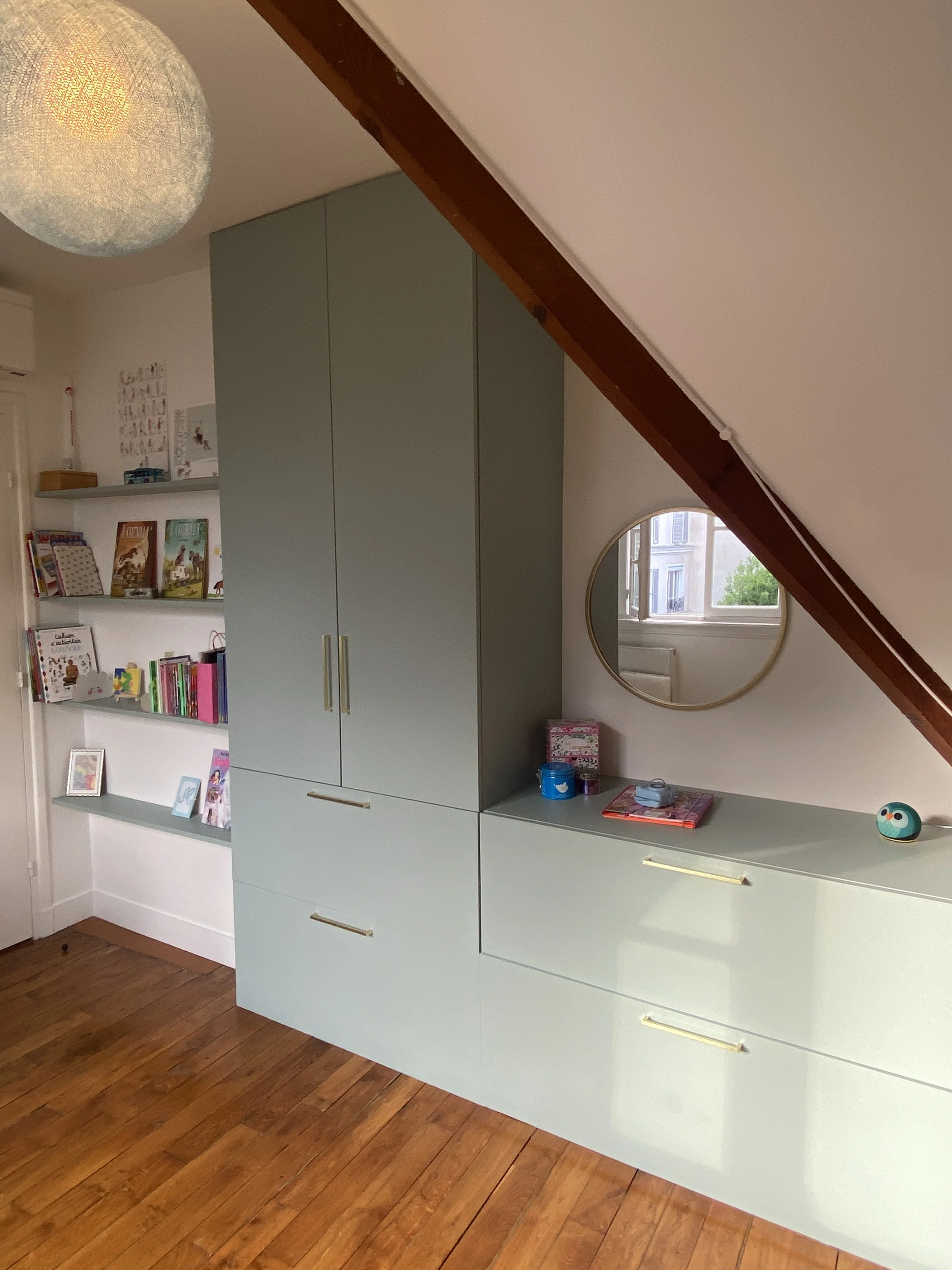 Gambetta est un projet d’aménagement sur mesure dédié à une chambre d’enfant, où la menuiserie joue un rôle central. L’objectif était clair : optimiser l’espace pour offrir à la fois confort, rangement et liberté de mouvement. Tout a été fait sur mesure dans cet espace mansardé et atypique. Un lit banquette a ainsi été intégré dans une alcôve, complété par une armoire au besoin de l’enfant et par des étagères, libérant le cœur de la pièce pour le jeu et l’imaginaire.